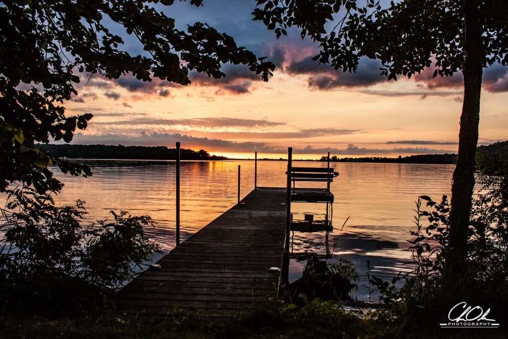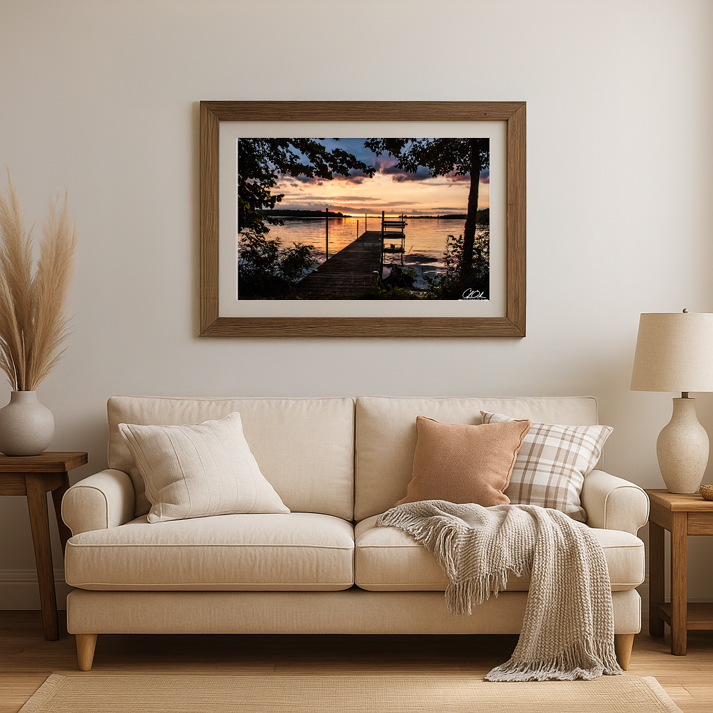 At the edge of the day, where light falls into shadow, a wooden dock extends into silent waters under a breathtaking sunset. The sky is a masterpiece, painted with streaks of gold and deepening indigo as the day whispers away. Leaves frame the scene, casting gentle silhouettes against the tranquil glow. One can almost feel the soft evening breeze and hear the faint lapping of water against the wood. It’s a moment suspended in time, evoking a deep sense of peace and contemplation.