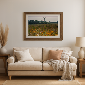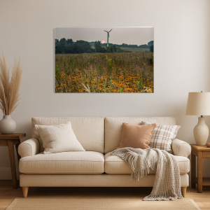 In this tranquil scene, the waning sun paints the sky with hues of pink and gold, gently kissing the horizon. A solitary wind turbine stands as a modern sentinel amidst a sea of wildflowers that sway softly, whispering secrets to the breeze. The distant trees form a dark silhouette, framing the meadow in a natural embrace. It’s a moment of peaceful transition where nature and technology coexist in harmonious stillness, evoking a sense of balance and quiet contemplation.