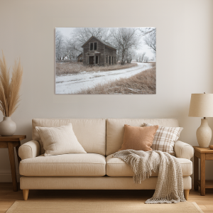 In this hauntingly beautiful scene, an old wooden house bears the weight of forgotten stories. The skeletal trees, dressed in a delicate layer of frost, frame the building like guardians in the whispering wind. The snow-laden path leads the eye into the quiet beyond, leaving one to wonder about the lives once lived here. This landscape captures a moment where time seems suspended, evoking a sense of nostalgia and solitude.